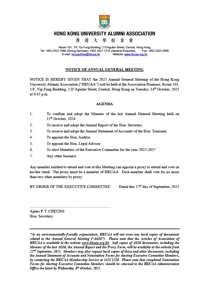 Notes: (1) Any relevant form should be returned to the HKUAA Administration Office at Room 810, Yip Fung Building, 2 D’Aguilar Street, Central, Hong Kong, before 18:00 on Wednesday, 8th October, 2025. (2) During verification process, the member whose name appears on the any of the forms may be contacted by telephone or email. Identification document(s) may be requested. (3) Any form which carries incomplete information, inaccurate information, information which cannot be verified with the HKUAA official record, unable to fulfill the verification process, duplicated submissions, or reach HKUAA after the submission deadline, will be declared void. (4) A Designated Proxy is the specific person that is appointed by the member other than the Chairman of the Meeting(s). The Designated Proxy must be an Ordinary / Life Member of the Association. Each Designated Proxy shall vote for no more than two other members by proxy. (5) The decision of HKUAA shall be final in case of dispute.